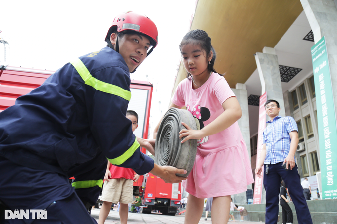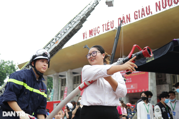 Theo Linh, khi tới triển lãm, em được các chiến sỹ PCCC hướng dẫn phun vòi nước cứu hỏa và các kỹ năng thoát khỏi nơi ở khi xảy ra cháy. Linh chia sẻ đây là một trải nghiệm rất hữu ích đối với các em học sinh khi tới tham quan triển lãm.