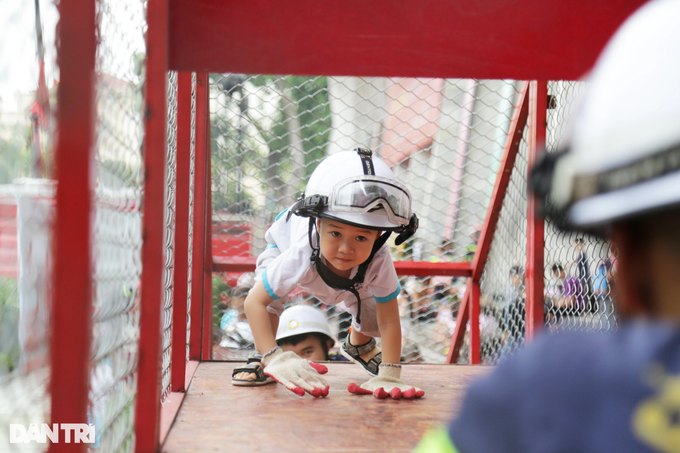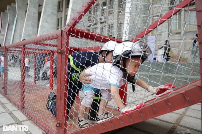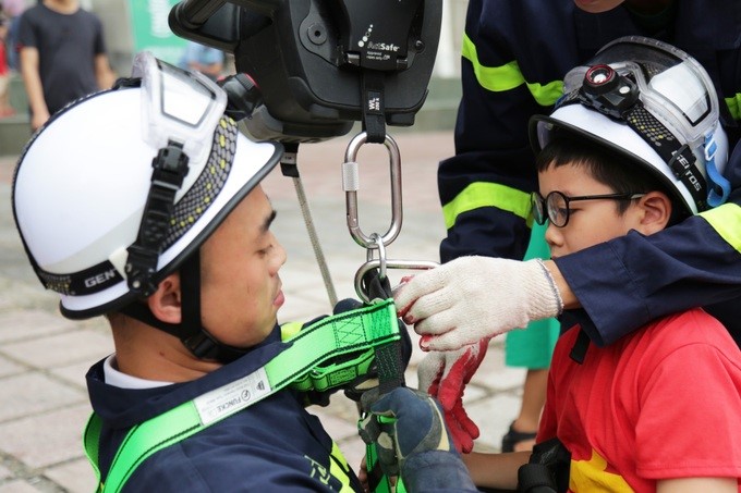 Để giúp người dân được trải nghiệm cách thoát nạn an toàn, cảnh sát PCCC đã hướng dẫn mọi người đeo bám vào thiết bị dây cẩu, được trang bị khóa an toàn cùng các chiến sỹ PCCC.