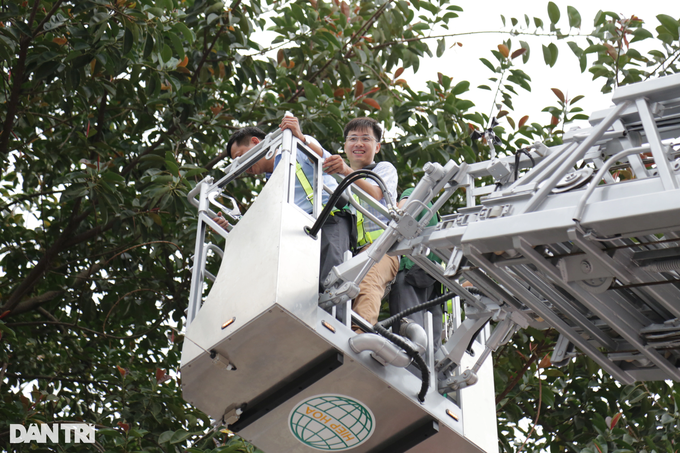 Anh Đông (đeo kính) trải nghiệm việc thoát nạn khỏi các khu nhà chung cư khi xảy ra cháy bằng xe thang (Ảnh: Trần Thanh).
