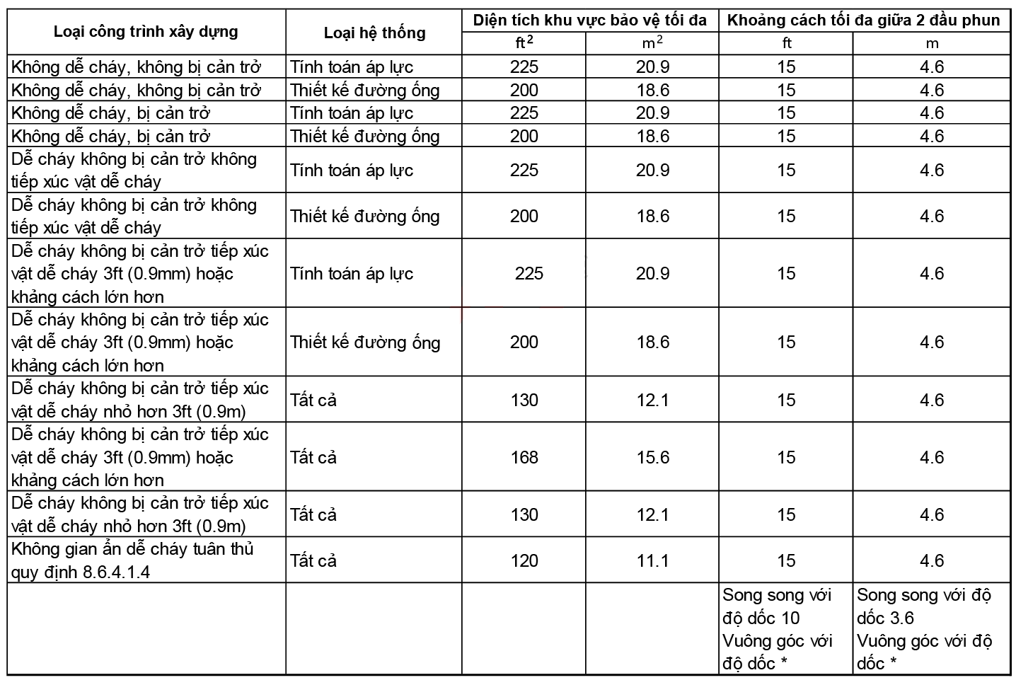 Ø Khoảng cách tối đa giữa 2 đầu phun phụ thuộc khu vực và tuân theo bảng bên dưới: